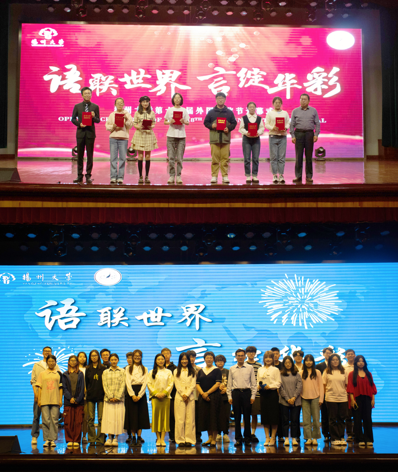 5月15日晚,外国语学院在文体馆举办扬州大学第十八届外国文化节开幕式暨“外院青年说”分享会活动。全体院领导,外国语学院原副院长、院关工委创新创业导师于建华老师,各系(部、中心)、部门主要负责人,全体辅导员和师生代表参加此次活动。