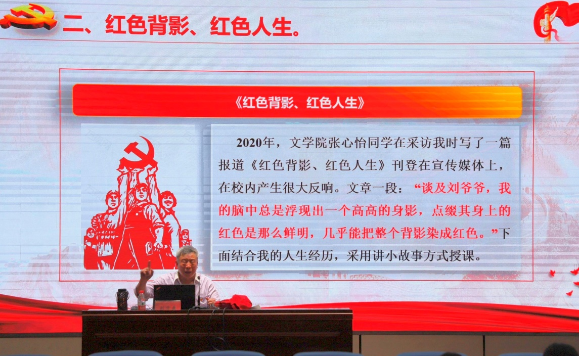 紧接着,刘老师结合自身的人生经历,向同学们讲述了他的苦难童年、入党的初心以及援越抗美时的种种故事。这些真实而感人的经历,不仅让同学们深刻体会到了革命前辈的艰辛与付出,更激发了他们坚定信念、勇敢担当的决心。刘老师着重强调,新时代的青年大学生应秉持坚定的理想,勇敢地肩负起时代赋予的使命,面对困难与挑战时毫不退缩,持续不懈地努力和奋斗。