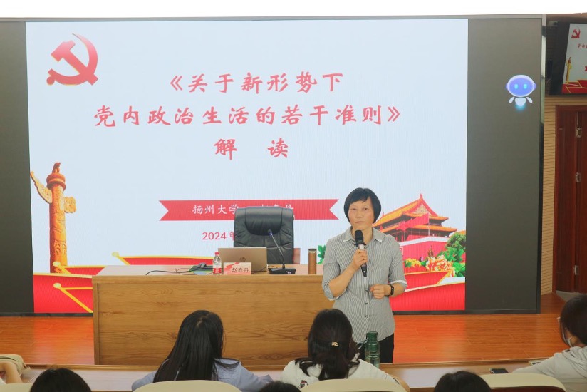 学院邀请扬州大学关工委副主任、外国语学院关工委常务副主任赵春丹老师为全体学员解读《关于新形势下党内政治生活的若干准则》,分为四个部分:新形势下党内政治生活准则制定背景及原因、存在的主要突出问题、主要内容以及主要特点。通过赵老师的专业讲解,学员对党内政治生活有了更加全面且具体的认识,深知政治生活红线碰不得,要洁身自好,以优秀党员标准严格要求自己。