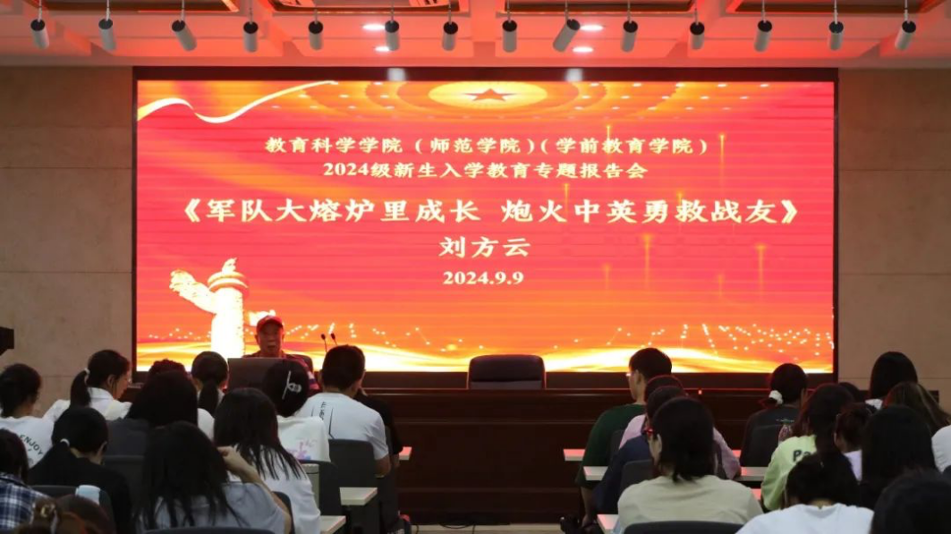 为传承红色精神,激发爱国情怀,增强纪律意识,提升责任感和使命感,近日,教育科学学院(师范学院)(学前教育学院)在8号楼S205报告厅举办2024级新生入学教育专题报告会,我校关心下一代工作委员会(下文简称关工委)的刘方云老师以《军队大熔炉里成长 炮火中英勇救队友》为主题做讲座。