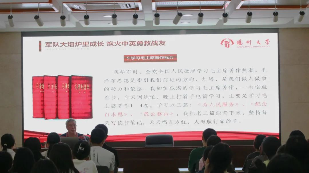 在军营里,刘爷爷积极学习马列主义和毛主席著作,自己学习理发技术为同志们服务,践行雷锋精神,参加救火工作,立下很多功绩,在部队中连续得到提拔。后来,刘爷爷参加了抗美援越战争,在1968年的“1.18”战斗中冒着美军倾泻的火力救下战友。他还分享了几个战斗英雄的故事,鼓励同学们要传承好红色革命道路上不怕困难、勇担重任的精神,牢记自己的使命与责任,做一名负责的人民教师。
