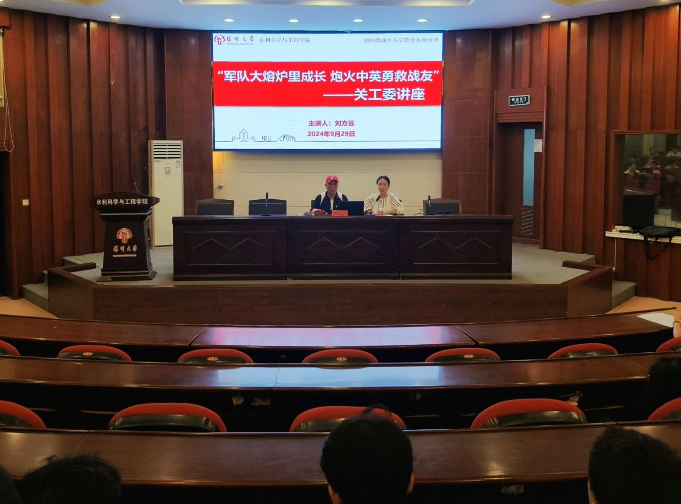 9月29日晚,我院在水利楼报告厅开展2024级新生入学教育,邀请老同志刘方云老师为全院300余名新生做“军队大熔炉里成长,炮火中英勇救战友”——关工委讲座。讲座由辅导员安文丽老师主持。