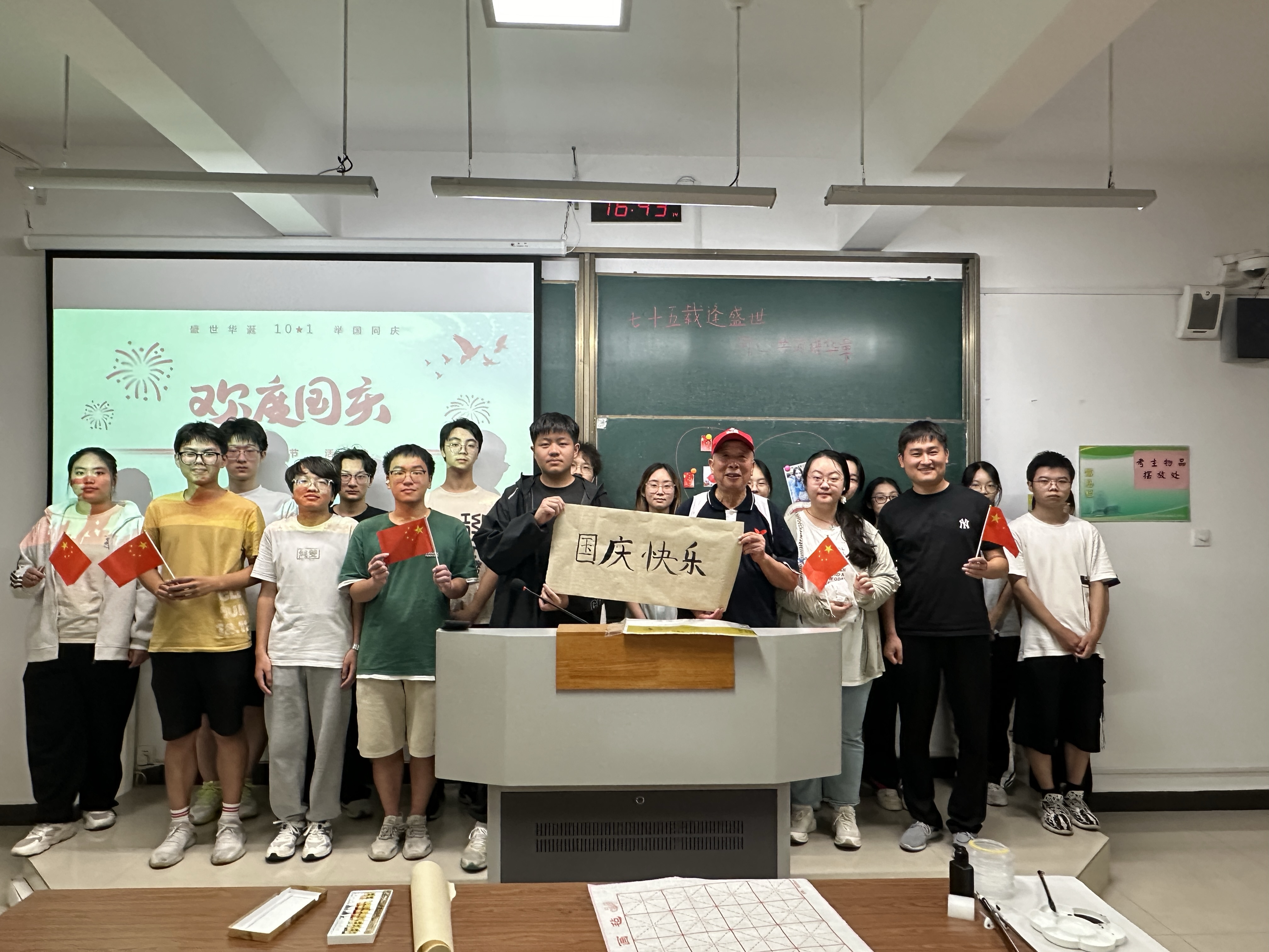 活动开始,刘方云老师带领班级同学回顾新中国的发展历程,展示了国家的伟大成就,培养学生的家国情怀。之后,全班同学与刘方云一起用毛笔写下“国庆快乐”,这不仅加深了学生与关工委及学院教师的羁绊、又提高了学生的传统文化实践能力,营造出浓厚的国庆氛围,让师生在欢乐的氛围中共同庆。最后,同学们们在黑板上张贴自己与国旗的合影,这是刘应启班同学献给祖国妈妈的情书。