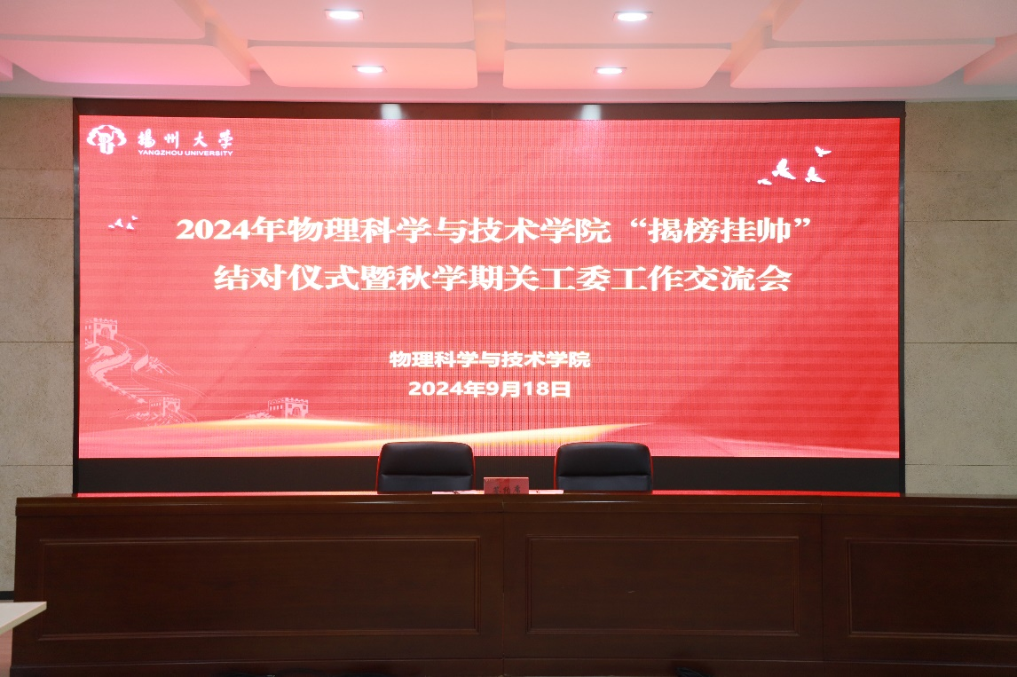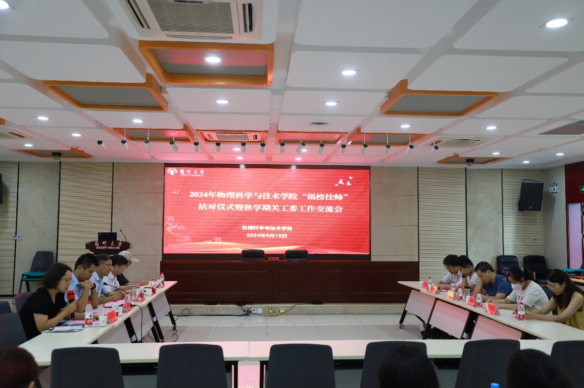 为进一步推动学院学生参与科技创新,促进学院关工委工作的常态化与高效化,近日,物理学院于8号楼S205举办了2024年物理科学与技术学院“揭榜挂帅”结对仪式暨秋学期关工委工作交流会。院党委书记、关工委名誉主任王春雨,院关工委常务副主任顾长华,院关工委副主任石竹南,院团委书记、学工办主任张月明,院团委(学工办)全体成员 ,“揭榜挂帅”结对项目师生代表参加会议。会议由院党委副书记毕瑜林主持。