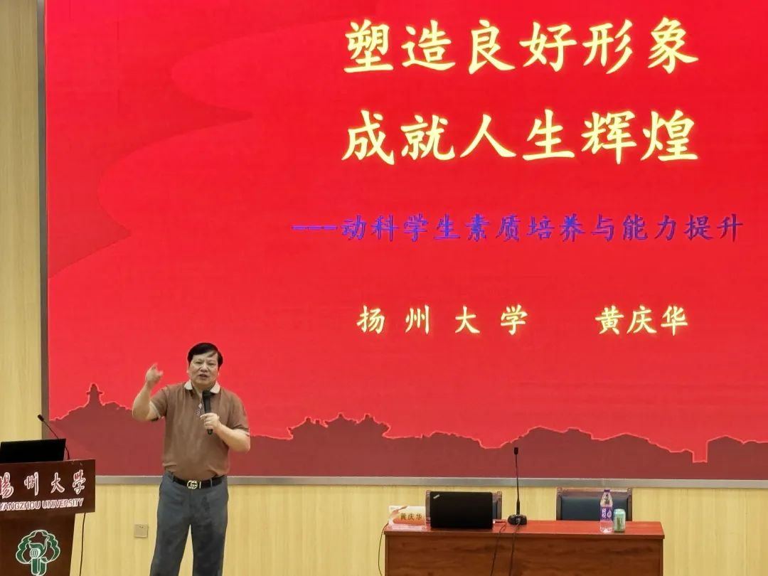 讲座伊始,黄庆华提到无论是我院今年刚入学的新生还是即将毕业的大四同学,都处在要确立新的目标,迈入新的道路的阶段,动科学生面临“四大时代格局”,分别为:世界——百年未遇巨大变局、中国——中华民族伟大复兴、专业——乡村振兴宏大战略、自我——成长发展重大机遇。黄庆华结合几位扬州名人的故事,强调“吾日三省吾身”,提醒同学们应该思考自己在接下来的生活中要树立怎样的形象,如何去树立形象。