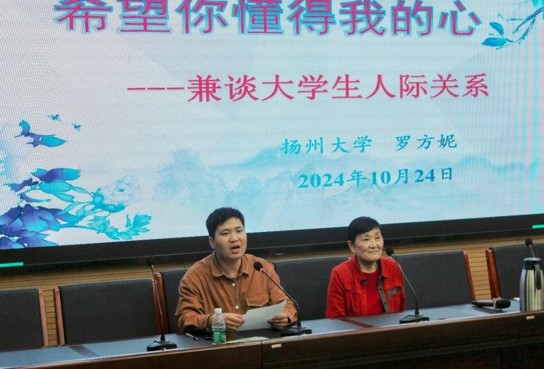 为加快新生对大学生活的适应,提升人际关系处理能力,促进校园和谐氛围的构建,我院于10月24日晚7点举办以“希望你懂得我的心——兼谈大学生人际关系”为主题的2024级新生入学教育讲座。本次讲座特邀扬州大学副教授、校关工委心理健康辅导组成员罗方妮老师为主讲,活动由辅导员万小彬老师主持,2024级全体新生参与活动。