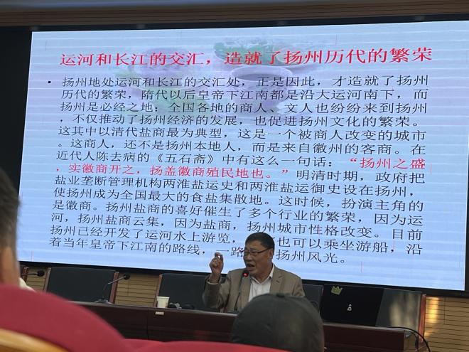 潘教授凭借形象生动的语言和一系列详实的案例,深刻剖析了运河文化所蕴含的深厚底蕴及其无可替代的历史价值。从古老的运河遗迹到沿岸的风景名胜,从古典诗词的韵味到现代运河开发的新风貌,牢牢的吸引了同学们的关注。老教师和同学们认真聆听,不时点头表示赞同。在互动环节,大家纷纷发言,提出自己对运河文化传承与旅游创新的见解和建议。