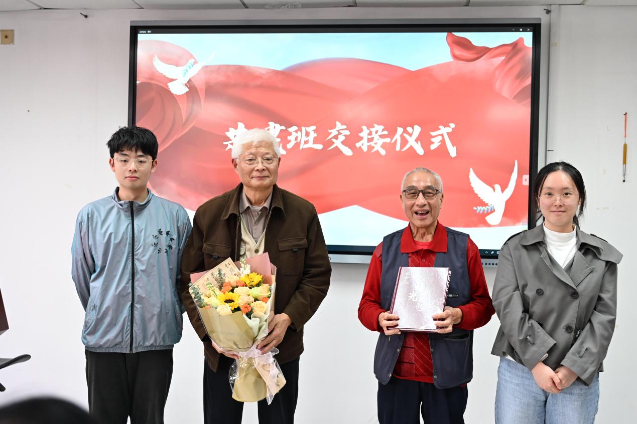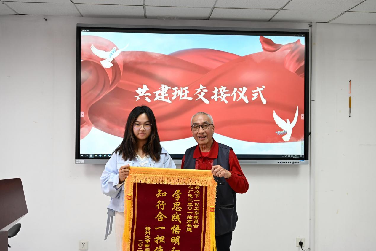 广电2101班老生代表向结对共建老同志——严公宝和孙放老师表达了真挚的感谢并献上同学们亲手制作的感恩礼物。广电2301班班长代表新结对班级发言,表示新结对班级全体同学将在学校和学院关工委的共同关心关怀下,努力将班级建设成为优秀且充满活力的集体。广电2101班与2301班交接结对共建锦旗。