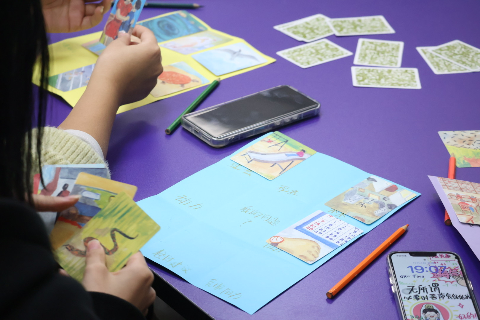 “我认为这张牌代表着我的过去,画面上的卧室代表了舒适圈,我今后要尽力突破、争取新的进步。”在施文洁老师的引导下,多名同学主动与大家共同分析自己的“OH卡牌”,分享着自己的感悟。之后的小组讨论过程中,同学们积极讨论着自己的困惑和启发,对于此次活动收获颇丰。