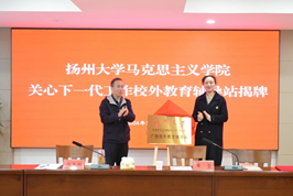 会上,院党委副书记黄蓉与广陵区关工委主任郭长明为“扬州大学马克思主义学院关心下一代工作广陵校外教育辅导站”揭牌,并为“五老”代表颁发校外指导老师聘书。