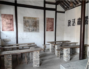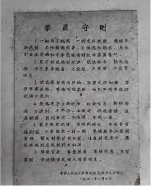 出了纪念馆,步行不远处就是“真武庙”,抗大八校校舍旧址就在其中,砖头和门板垒成课桌,学员就在这样艰苦的环境下学习上课,不同的课程安排对应着共同的学员守则——“一切为了抗战,一切支持抗战,积极参加抗战”。
