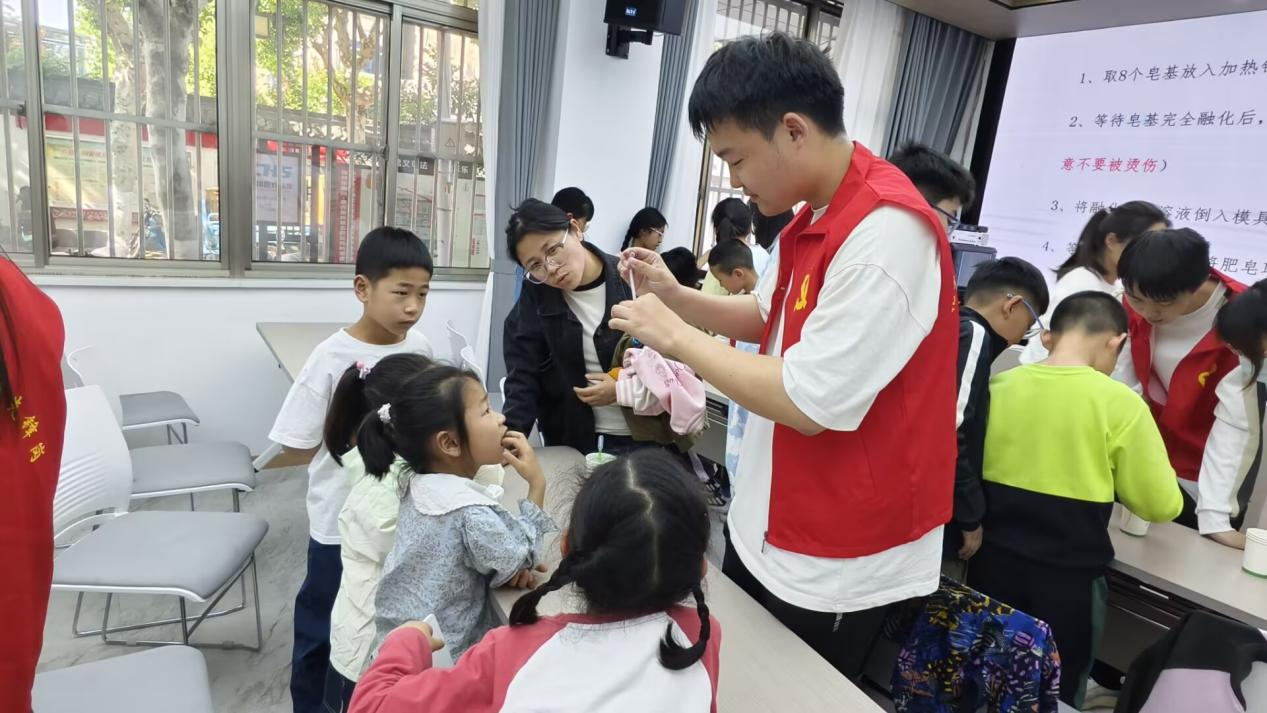 在“红色化学家”事迹宣讲后,鲁米诺化学发光实验瞬间点燃现场气氛,孩子们的惊呼声此起彼伏。随后,趣味实验环节正式开启,小朋友们分为两组,交替体验“创意手工皂”和“色彩分层”实验。“创意手工皂”实验区,志愿者樊安远、李娜和丁哲曦默契配合。李娜与丁哲曦负责加热融化皂基,将融化后的皂基递到小朋友面前,引导他们加入喜欢的颜色并搅拌,再协助倒入模具冷却;樊安远则全程守护,防止小朋友触碰高温容器。阚老师也全程陪同,耐心向孩子们讲解实验原理,传递化学知识。“色彩分层”实验区,志愿者傅恒、王天晨和鹿裕林先详细介绍实验物品,随后用提前配置好的各色白砂糖溶液进行演示,着重强调缓慢操作的关键要点。展示结束后,孩子们迫不及待地在志愿者指导下动手实验,成功完成后,纷纷高举试管,兴奋地向同伴和家长展示自己的成果。整个实验过程中,阚老师与志愿者时刻关注孩子们的操作,及时给予帮助与鼓励。活动结束,每个小朋友都收获了属于自己的手工皂,脸上洋溢着灿烂的笑容,高高举起作品与他人分享喜悦。