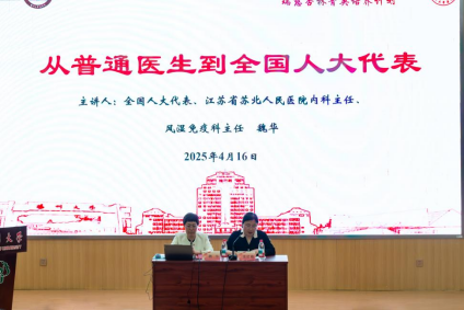 为传承医者精神,强化学生社会责任与担当意识,医学院关工委品牌活动“惠生讲堂”正式开讲。4 月 16 日,院关工委、院团委邀请全国人大代表、江苏省苏北人民医院内科兼风湿免疫科主任魏华教授带来一场题为 “从普通医生到全国人大代表”的精彩讲座。讲座由院党委副书记左红梅主持,关工委及师生代表参加活动。