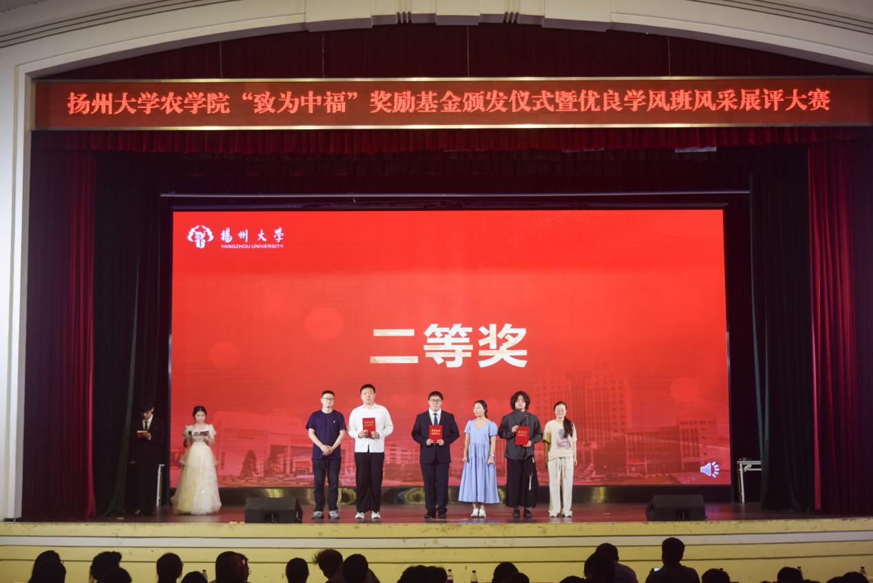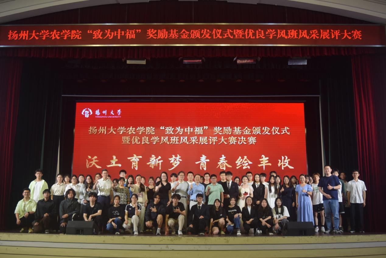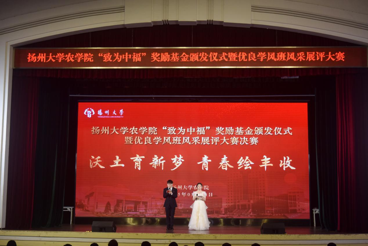5月19日,我院在文汇路校区大礼堂举办扬州大学农学院“致为中福”奖励基金颁发仪式暨优良学风班风采展评决赛,扬州中福生物技术有限公司总经理魏涛、江苏致为化工有限公司副总经理练传栋、院党委副书记周立云老师、院关工委常务副主任黄祖六老师、院关工委委员刘世平老师、决赛班级班主任老师代表、院团委(学工办)老师和各学生机构代表等出席活动。