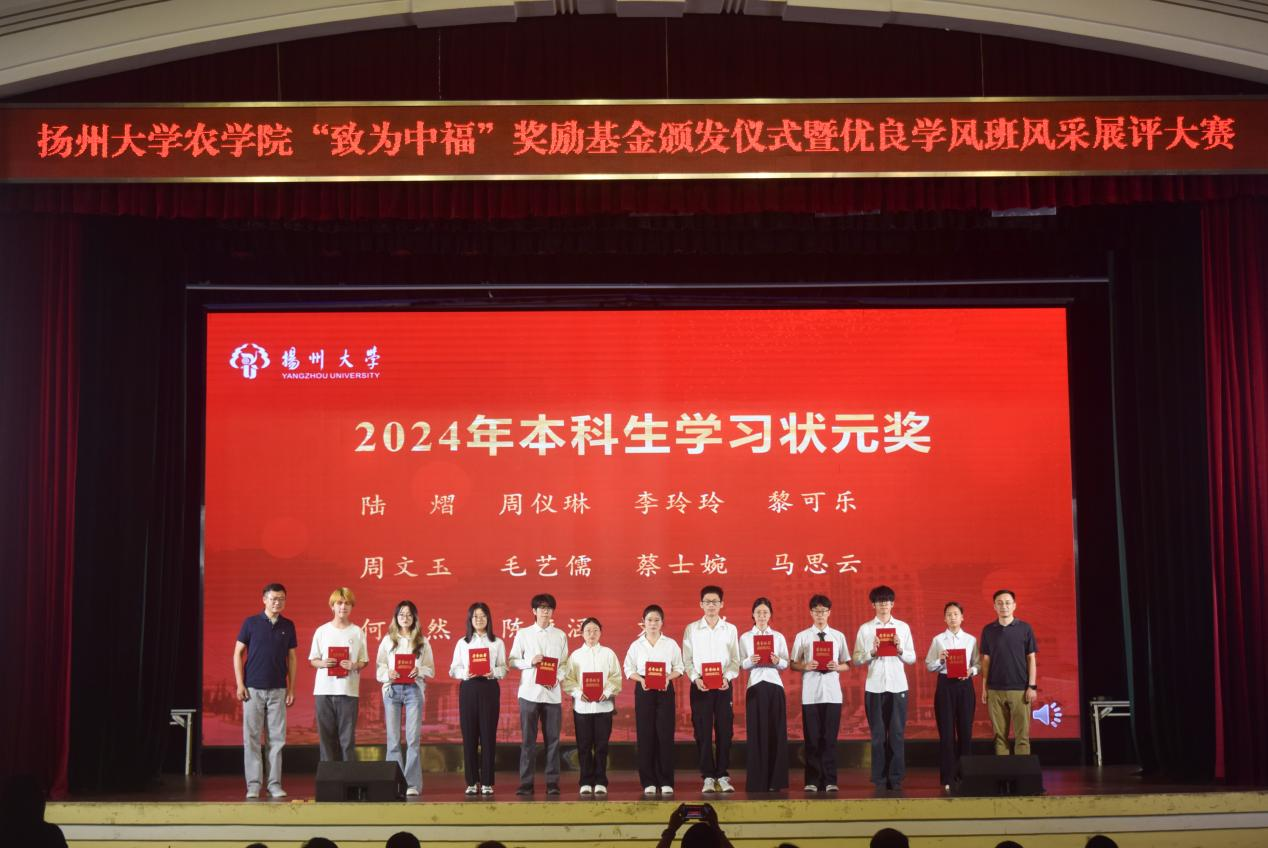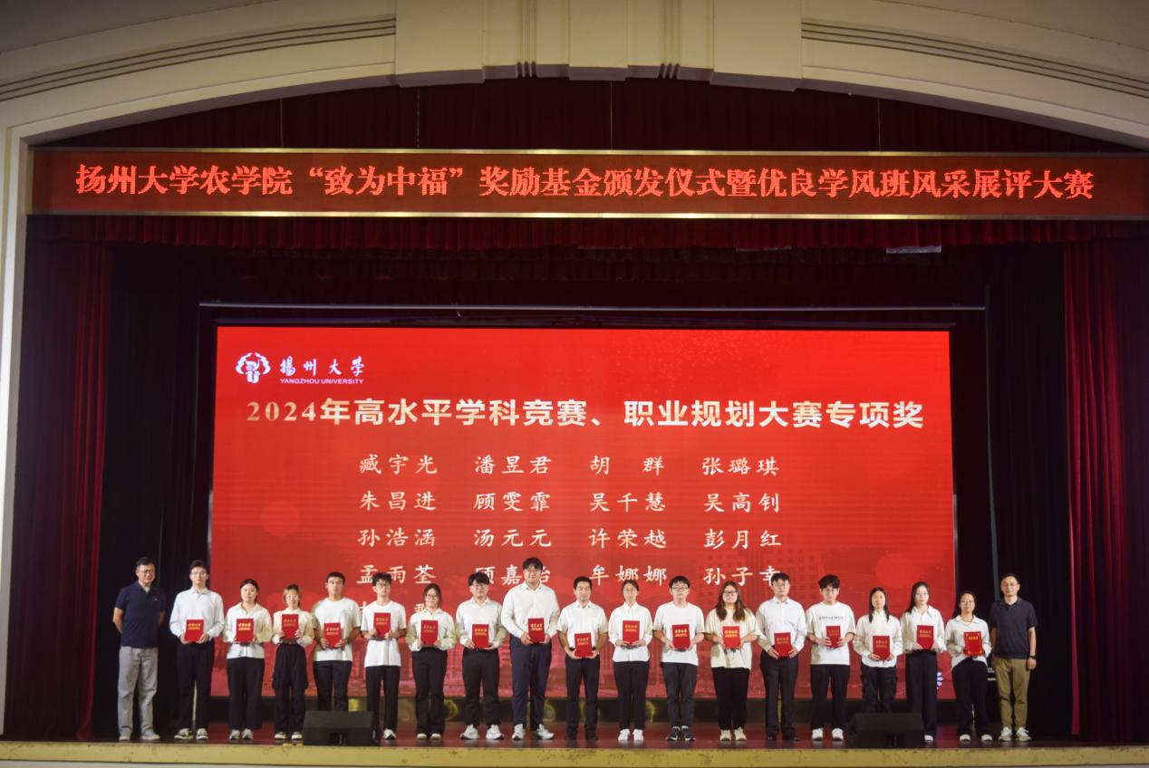 为支持农学院事业发展,提高人才培养质效,学院校友企业江苏致为化工有限公司、扬州中福生物技术有限公司共同向扬州大学教育发展基金会捐资设立“扬州大学农学院‘致为中福’拔尖创新农科人才奖励基金”。2024年度共有11名本科生获学习状元奖、17名学生获高水平学科竞赛、职业规划大赛专项奖。扬州中福生物技术有限公司总经理魏涛、江苏致为化工有限公司副总经理练传栋为获奖同学颁奖。