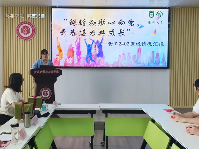 接过共建班级的接力棒,食工2402班班级代表王妍霖汇报班级基本情况。经过近一年的成长,同学们都紧密团结,在班团建设和科创活动等中都取得一定成绩。食工2402班也将在关工委老同志和学院领导的带领下,践行初心,不断成长,勇攀高峰。