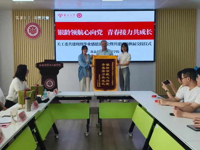 吴玉琪同学汇报完毕后,食安2101班学生代表为关工委老同志们赠送精心准备的感恩礼物,赠送的礼盒上写有同学们饱含真心感激之情的贺卡。老同志们则为食安2101班全体同学赠上校友徽章,徽章中蕴含着对毕业生们的美好祝愿。在温馨的互赠礼物环节之后,迎来共建班级交接仪式。当旗帜从食安2101班的团支书徐艺手中,经由蒋建刚老师,再传递到食工2402班的团支书王妍霖手中,这不仅是一份责任在传递,更是一种精神信念的延续。