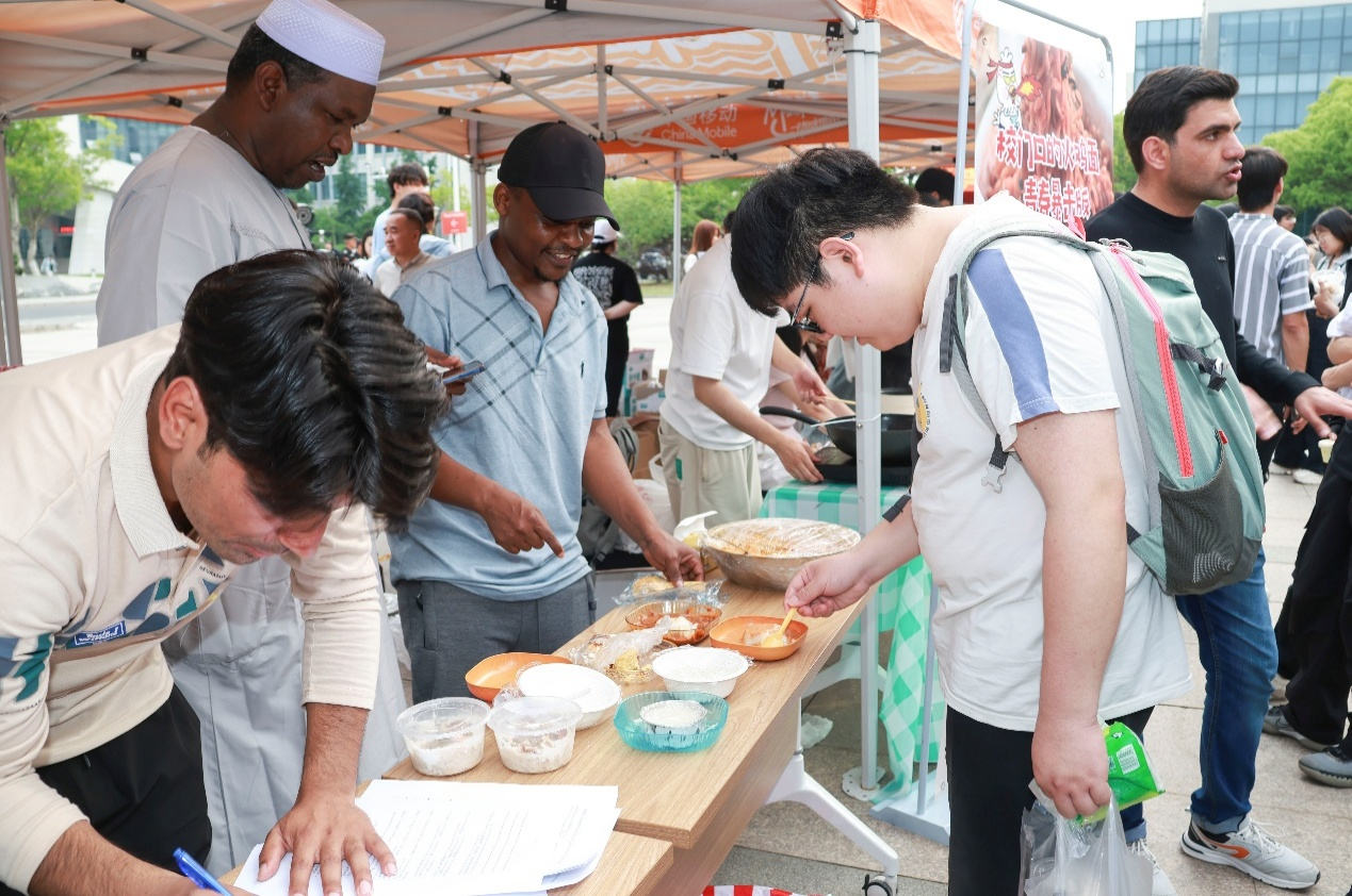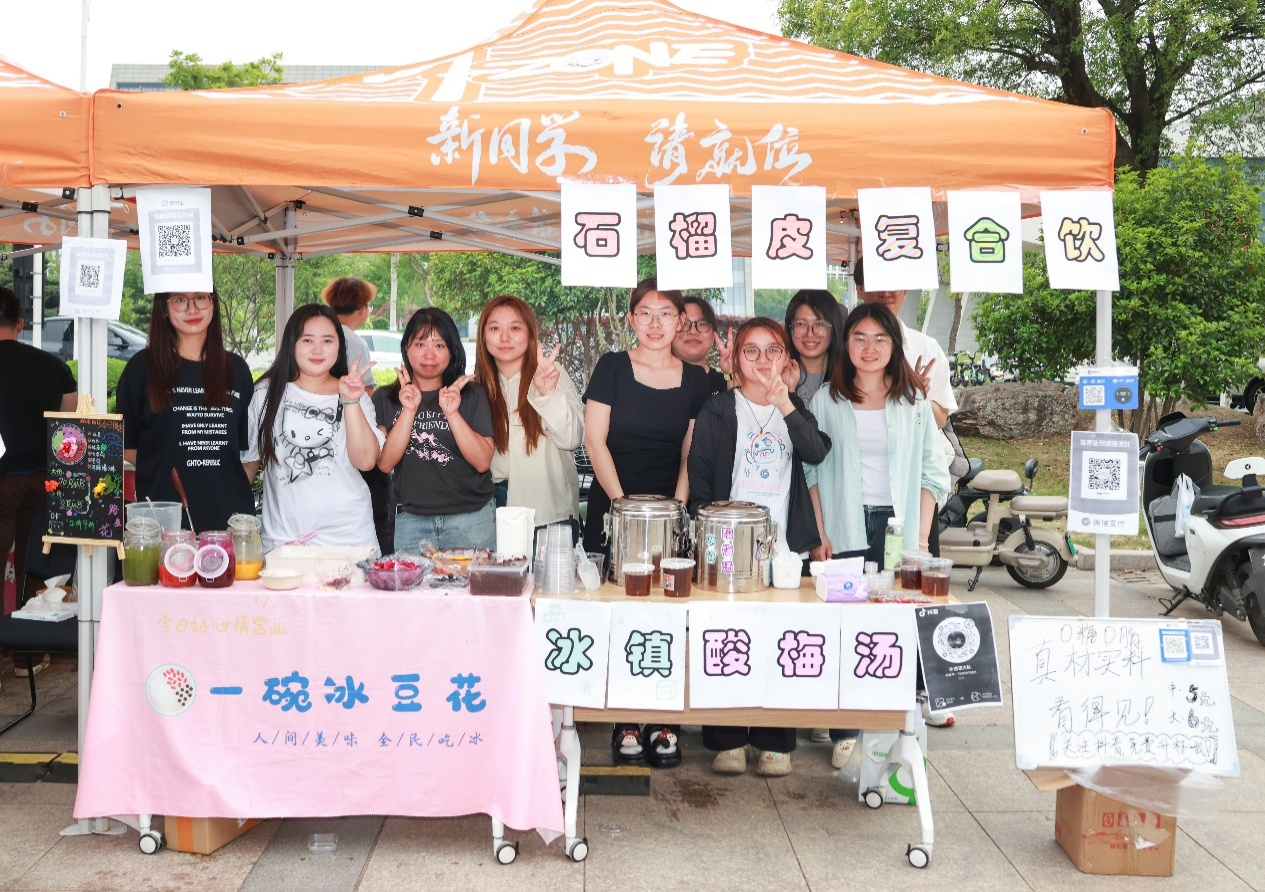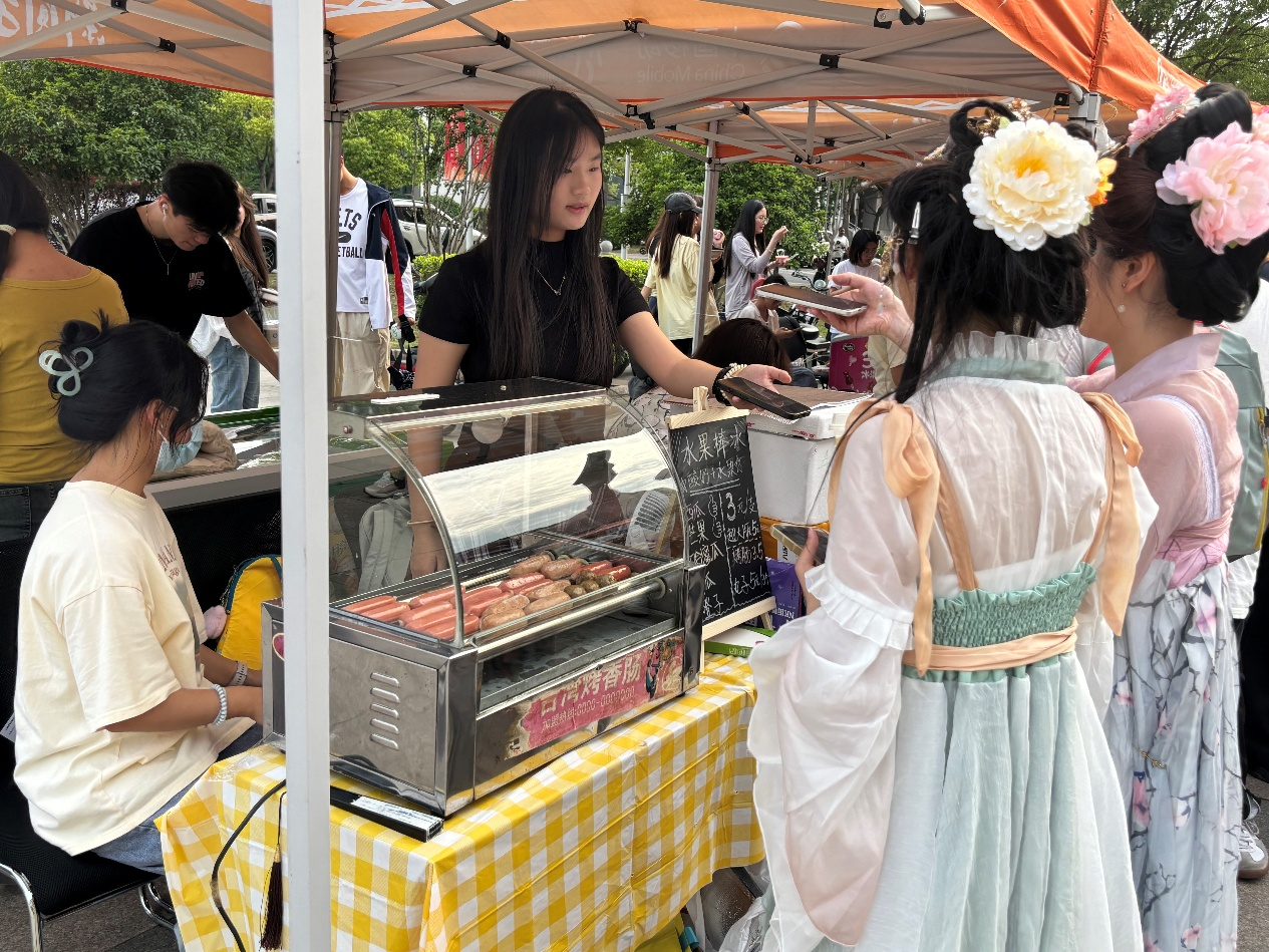在本届食品科技文化节上,学院学生展示了自己研发的一系列健康又美味的食品,比如低糖清凉水果水晶饺子、减脂轻体豆花甜品、低卡高纤魔芋奶茶、药食同源茶饮混萃……每一种美食都能让大家在满足味蕾的同时还不用担心体重健康。除此以外,还有来自其他国家的特色美食,如巴基斯坦的牛肉抓饭、尼泊尔的现代改良米布丁、孟加拉的高纤维蔬菜烩饭等等。每一个摊位前都有许多人试吃购买,现场热闹非凡,其乐融融。互动区的现场更是人声鼎沸。在这里,同学们沉浸式体验糖画、棉花糖和糖葫芦DIY。麦芽糖勾勒出活灵活现的生肖图案,棉花糖机吐出蓬松的糖丝,最热闹的当属糖葫芦摊位,将洗净的水果串在竹签上,再把每一颗都裹上糖浆,最后冷却定型,一串糖葫芦就做好了。体验的同学们都纷纷表示:“除了享受到甜蜜,更享受到的是自己创作的乐趣。”除了学生们手工制作的产品,学院的合作企业,如上海昊岳、扬大康源、方广食品等企业,他们也带着各自的产品,让同学们感受到食品的多样性与独特性。通过与这些企业的交流,学院学生也了解了如何将专业知识与实践结合,应对创新创业的挑战与机遇。