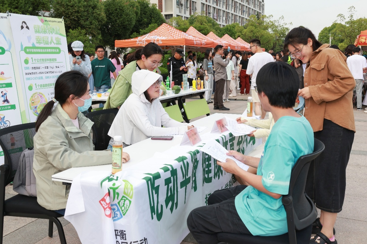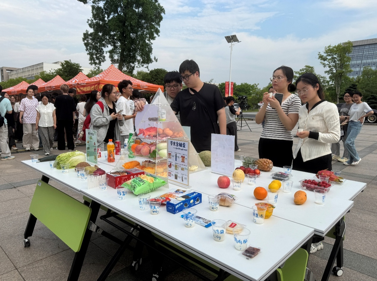 为了更好地将体重管理融入大家的日常,扬州大学附属医院营养科主治医师邹蓓蓓医生也受邀来到现场,与学院共同搭建起“医食协同”科普区,在展台上摆放各种食物,通过白砂糖的克数向大家直观地展示了各种食物的含糖量,同时根据体重指数给大家推荐合理的饮食方式以及运动方式。