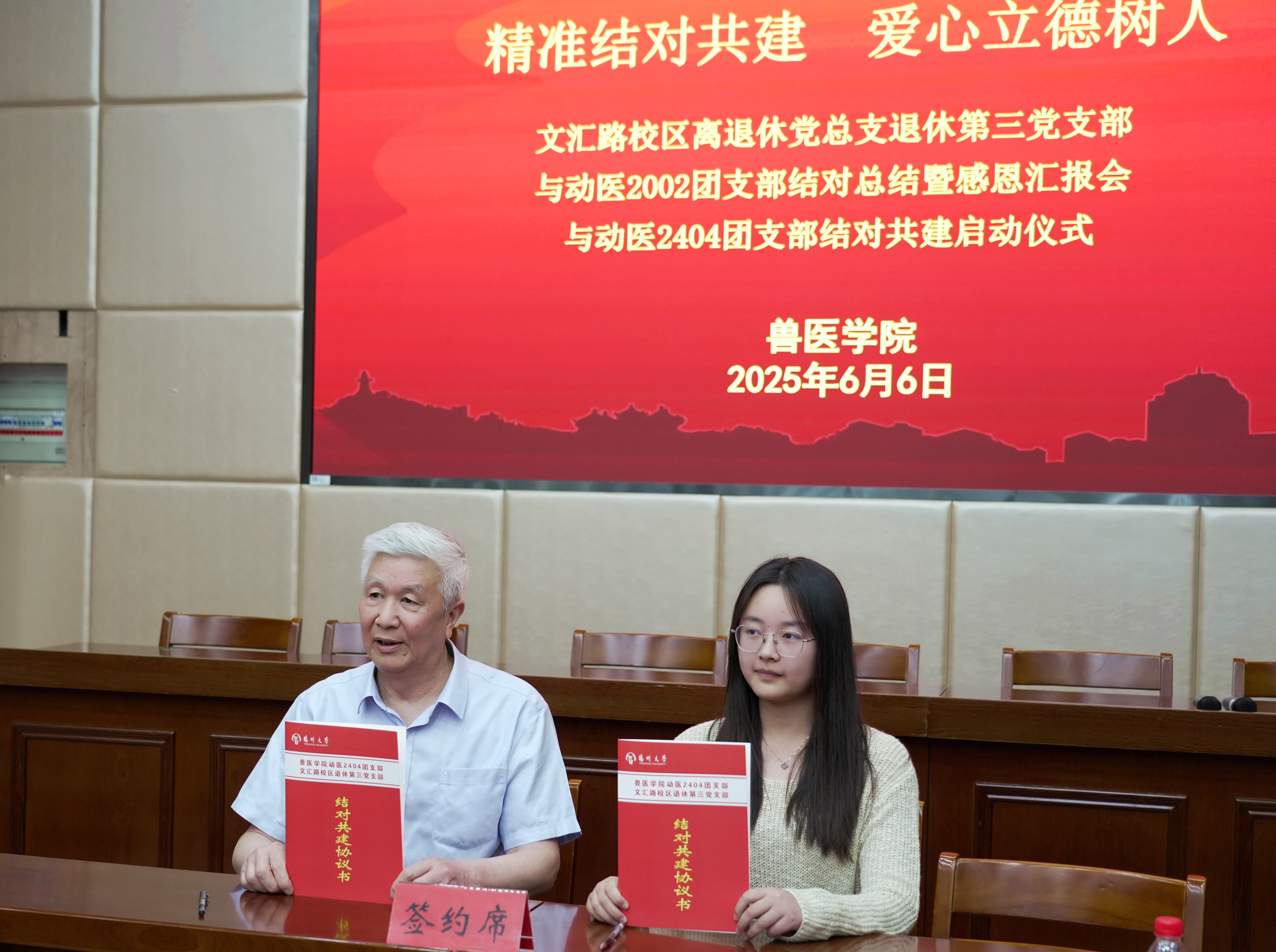 随后,退休第三党支部陈鹏书记与动医2404团支部蒯欣蕊签约。刘恩昊雨代表动医2404班发言。“作为新时代动医青年,我们既是精神的传承者,更是实践的开拓者。”他表示,“老一辈党员用坚守诠释了兽医人的初心,我们将以专业为笔、以担当为墨,在动物医学的赛道上跑出青春加速度。在共建中,我们渴望汲取前辈智慧,更要用创新思维为传统赋能,让‘结对共建’在新时代迸发新活力!”