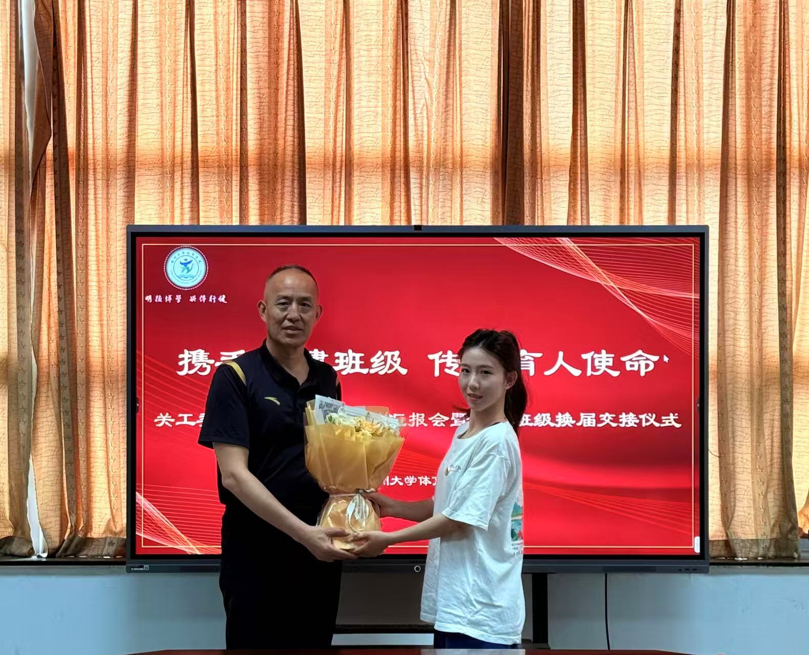 共建班级交接仪式环节,旗帜从体育2101班学生代表手中,经由高宝龙老师,再传递到民体2401班学生代表手中,这不仅代表着共建关系的正式延续,更象征着关工委关爱育人的优良传统在青年学子中生生不息、代代相传。