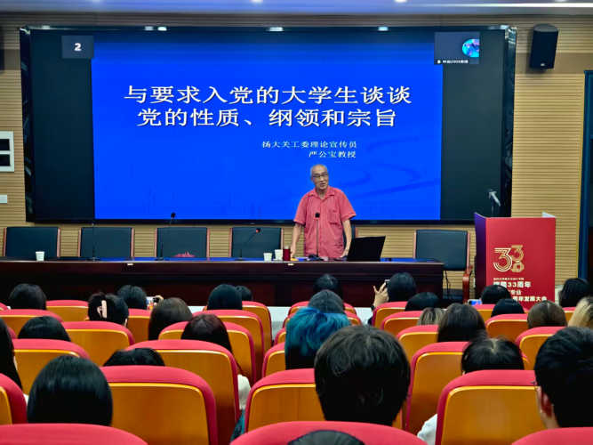 讲座中,严公宝教授深入浅出地阐述了“党的性质”、“党的纲领”、“党的宗旨”,引导大学生端正入党动机。新时代青年应当深刻理解“两个先锋队”的使命,争做思想坚定、行动自觉的先锋战士。