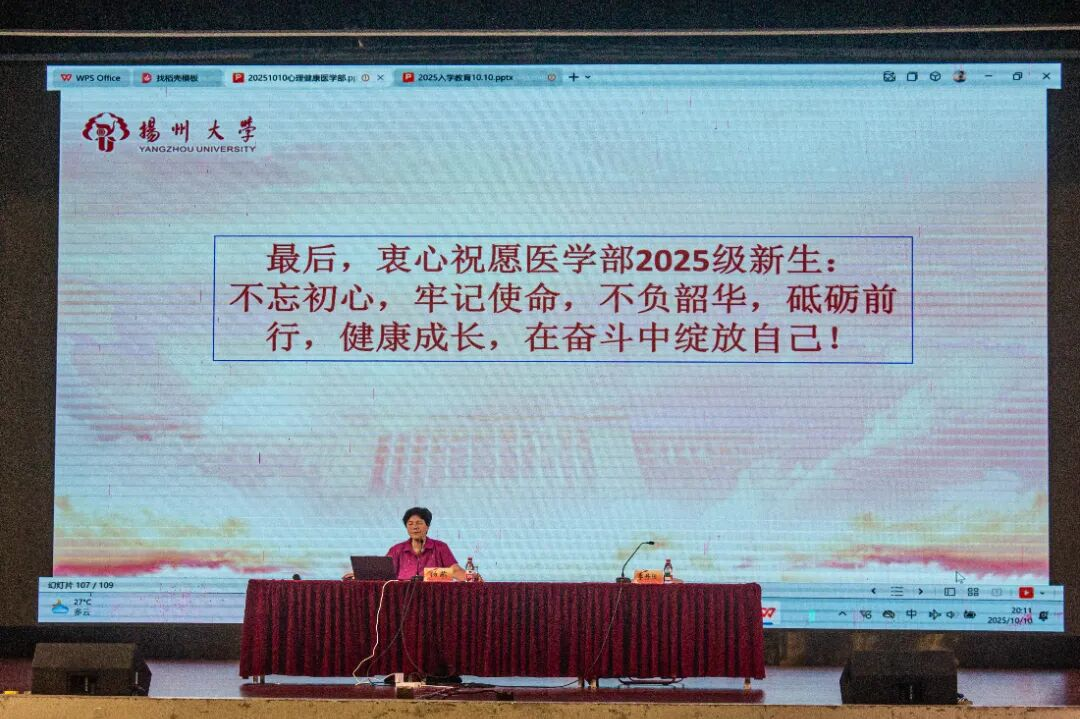 10月10日,医学部邀请校关工委理论宣传组(讲师团)杨燕老师,在文汇路大礼堂举办“如何做一名心理健康的大学生”新生入学教育专题讲座,全体本科生新生辅导员、2025级本科生、研究生参加,讲座由医学部团委(学工办)李丹阳老师主持。