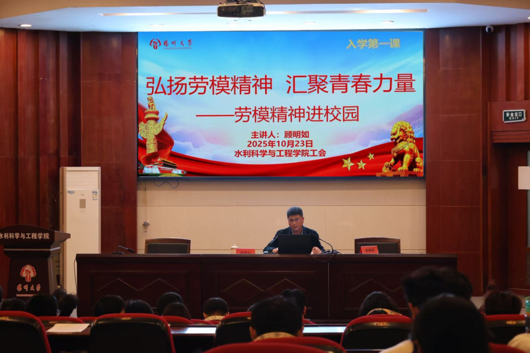 10月23日,水利学院在水利楼一楼报告厅举办2025级新生入学教育暨“弘扬劳模精神,汇聚青春力量”主题讲座。特邀全国五一劳动奖章获得者、省水建董事长,扬大91级水工专业校友顾明如以“水利人的底色与底气”为题,为新生们带来了一堂生动的入学第一课,分享其34年水利生涯的感悟,为25级新生开出就业导航图。