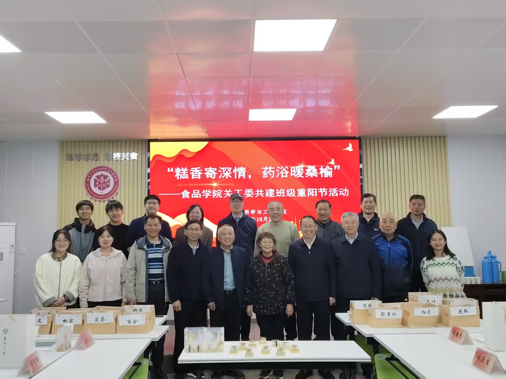 缕缕米香从蒸笼里飘出,淡淡草药气息弥漫在空气里。2025年10月28日下午,扬州大学食品科学与工程学院笃行楼内,一场别开生面的重阳节主题活动正在温馨进行。这场以“糕香寄深情,药浴暖桑榆”为主题的金秋敬老、薪火相传活动,将尊老敬老的传统文化传承与关心下一代的责任使命巧妙融合,现场洋溢着浓浓的师生情谊与专业特色。