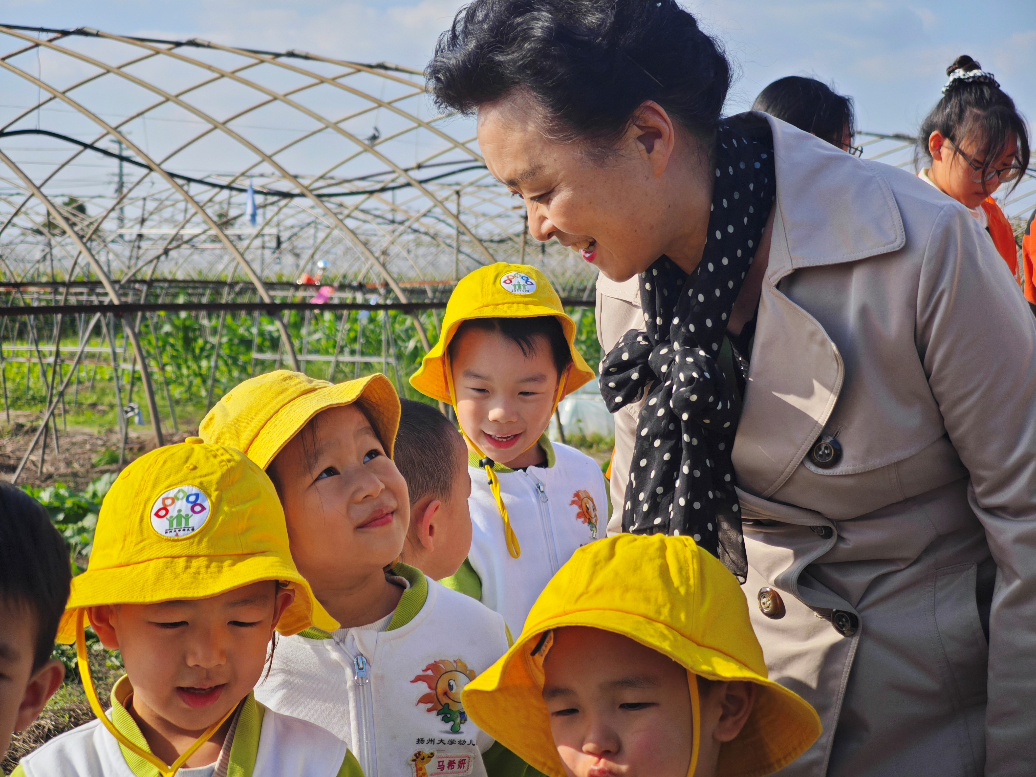 活动伊始,20余名学生党员与幼儿园小朋友简单结对。在农场主“找叶片密处轻挖红薯”的简短指导后,大家便分散至田间开始劳作。孩子们手执小铲好奇探索,学生党员从旁悉心协助。田间偶有笑语,整体氛围如常,直到姚蔚老师的到来,让这场活动迎来深意的转折。