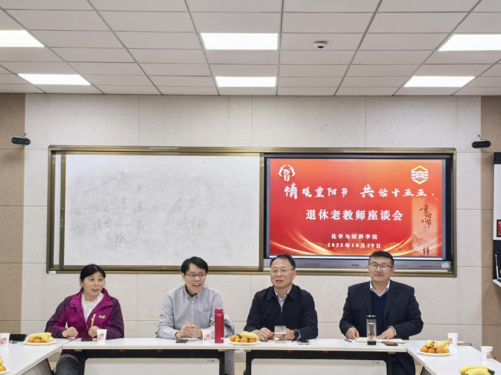 重阳敬老,共话发展。10月29日,化学与材料学院在新化馆S213温情举办“情暖重阳节,共话‘十五五’”退休教师座谈会。院党委书记、关工委名誉主任娄金海,党委副书记、关工委主任徐玉,副院长施慧,副院长、关工委副主任徐琴,院关工委委员徐永泰、阚锦晴、张国林等三十余位退休教师代表欢聚一堂,共庆佳节、共叙情谊、共商学院发展大计。会议由副院长徐琴主持。