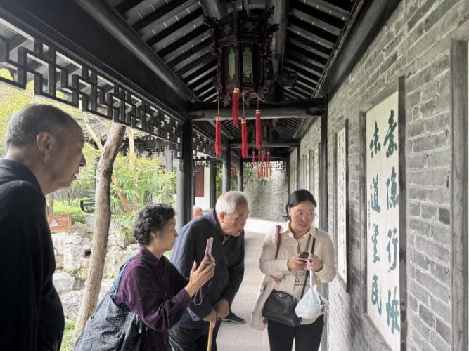 离开金东门老街后,团队前往毗邻的郑板桥故居。走进故居,灰瓦白墙的院落尽显古朴雅致,展柜内陈列的郑板桥书画真迹、为官时期的文书档案、日常使用的笔墨砚台等实物,生动还原了他的生活与仕途轨迹。老同志们结合历史背景,向学生代表进一步解读先贤“一枝一叶总关情”的执政理念,周恩来班学生们认真记录,纷纷表示要从中华优秀传统文化中汲取力量,将为民服务的意识融入成长历程。