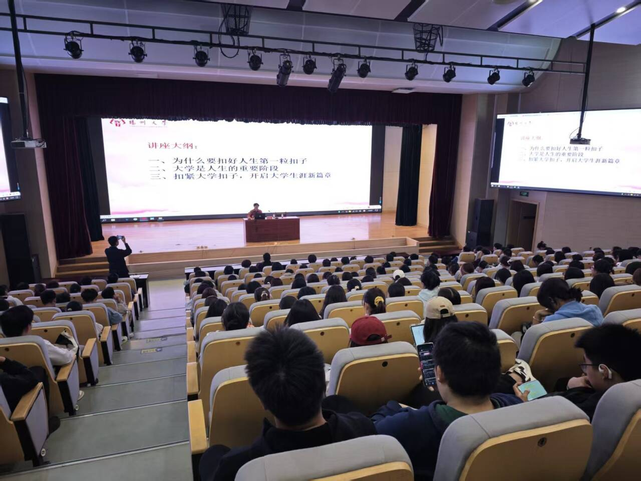 讲座期间,杨燕老师围绕“扣好人生第一粒扣子”这一主题,展开了深入指导。她先结合国家发展需求与时代使命,深入阐释了“扣好第一粒扣子”的核心意义,着重强调树立正确的人生观、价值观是人生发展的坚实基石。接着,她指出大学是学术探索的重要平台,也是个人成长的关键阶段,能够帮助新生实现从青涩走向成熟、从依赖走向独立的蜕变,为新生步入社会、成长成才筑牢根基。最后,她对新生提出了具体要求,鼓励大家以“正确三观”为引领、以“合理计划”为路径、以“严守规章”为底线,在提升综合素质的过程中不懈奋斗,真正“扣紧大学扣子”。