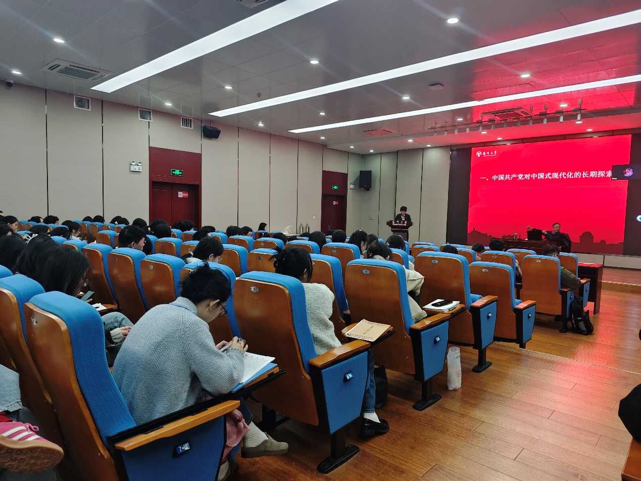 为深入学习贯彻党中央关于推进中国式现代化的战略部署,引导青年学子深刻理解时代责任与历史使命,11月13日,“理想·担当·吃苦·奋斗——新时代好青年与中国式现代化”为主题的专题党课于S405教室成功组织开展。本次党课特邀马克思主义学院教授、校关工委讲师团资深讲师费迅老师担任主讲,我院发展对象参加了学习。