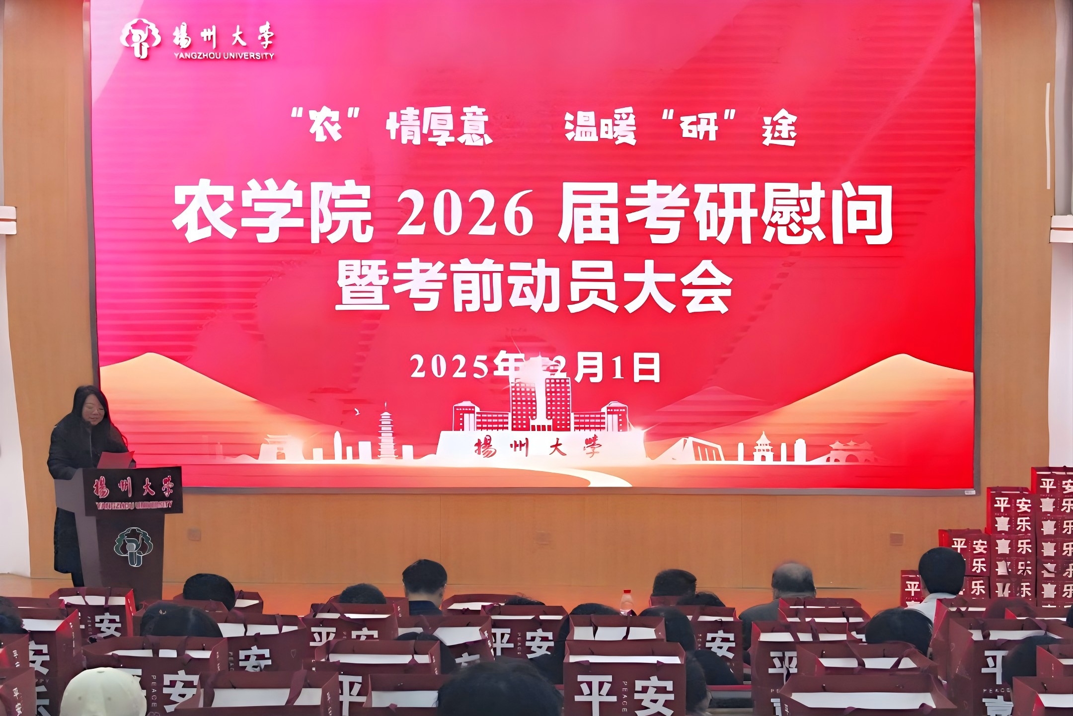 2026年硕士研究生招生考试临近,为帮助考研学子坚定信念、缓解压力,12月1日下午,农学院在荷花池校区逸夫图书馆报告厅召开2026届本科生考研慰问暨考前动员大会。院关工委名誉主任施林峰、院关工委主任崔益军、院关工委常务副主任黄祖六、团委(学工办)辅导员老师出席会议,2026届本科考研学子参加会议。会议由院关工委秘书长杜媛主持。