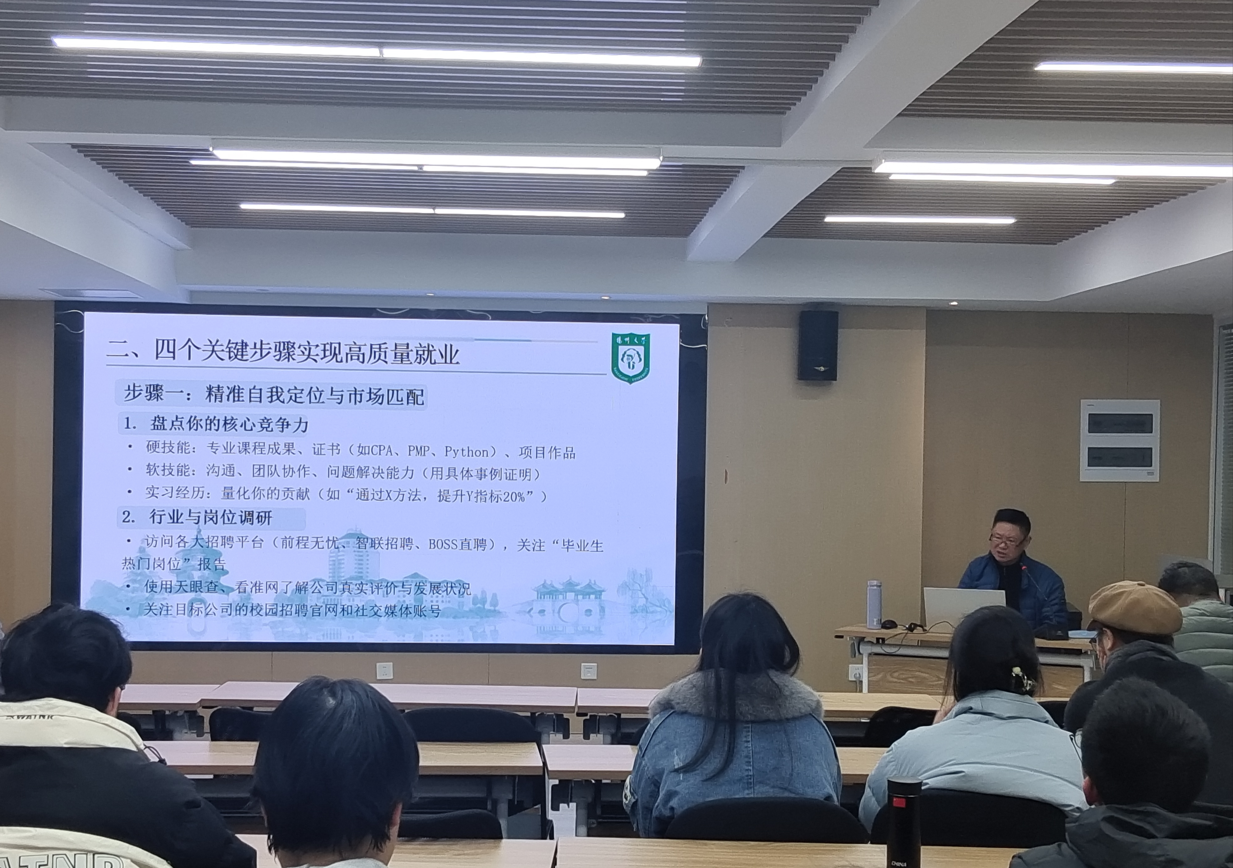 12月17日下午,环境学院特邀全球职业规划师、国家高级职业指导师、校关工委访企拓岗服务组杨桂元老师,在一站式服务社区多功能室为2027届学生作升学与就业指导讲座。讲座以“敢问路在何方,路就在脚下”为主题,围绕考研决策、就业实操与职业发展路径等核心内容展开,为学生带来了一堂实用的职业规划课。