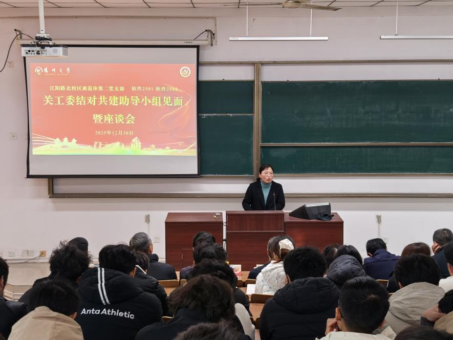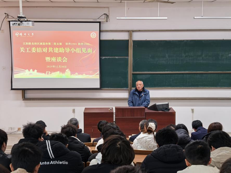 12月30日上午,信息与人工智能学院(工业软件学院)软件2501、2502班与江阳路北校区离退休第二党支部在扬子津西校区教学楼举办关工委结对共建启动仪式暨助导小组成员见面会。校朗月学生社区党工委副书记、校关工委秘书长兼办公室主任刘汉柏,江阳路北校区离退休党总支委员、第二党支部书记李宜祥,助导小组组长江阳路北校区离退休第二党支部宣传委员凌国顺,助导小组成员陈俊、杨燕,费宗琴、谢勇、包振强、杜宇人等老同志出席活动。院党委书记潘骏,党委副书记左红梅,共建班级班主任及全体学生参加活动。活动由学院团委书记张海兵主持。