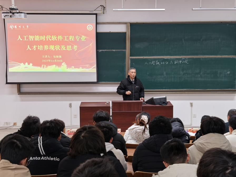 活动第二阶段,信息与人工智能学院(工业软件学院)退休教师包振强教授以“人工智能时代软件工程专业人才培养现状及思考”为题开展专题讲座。讲座围绕人工智能时代与软件工程的深度融合、基本功对成长上限的决定性作用、工程能力在实践项目中的锤炼提升以及软件工程的AI方向等四个维度展开,既有专业领域AI+、大模型、算力等前沿学科的深度解析,又有家国情怀的深情传递,既为共建班学生明确了专业学习方向,更激发了同学们投身软件行业创新发展的责任感与使命感。