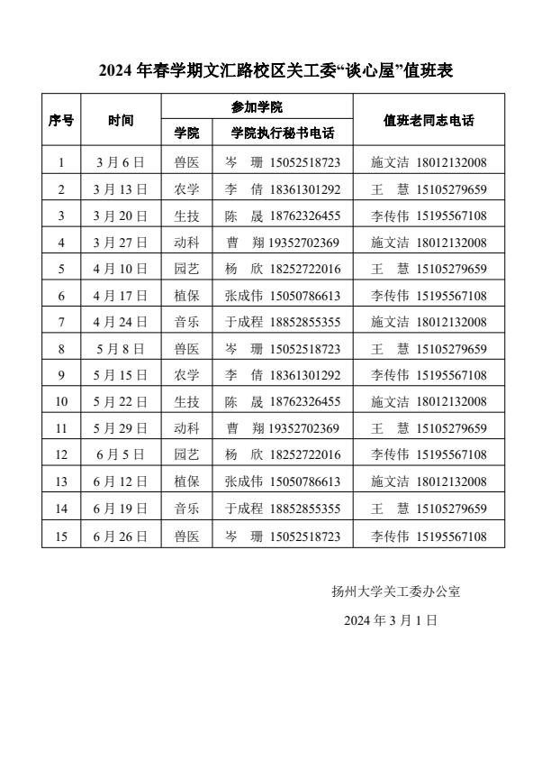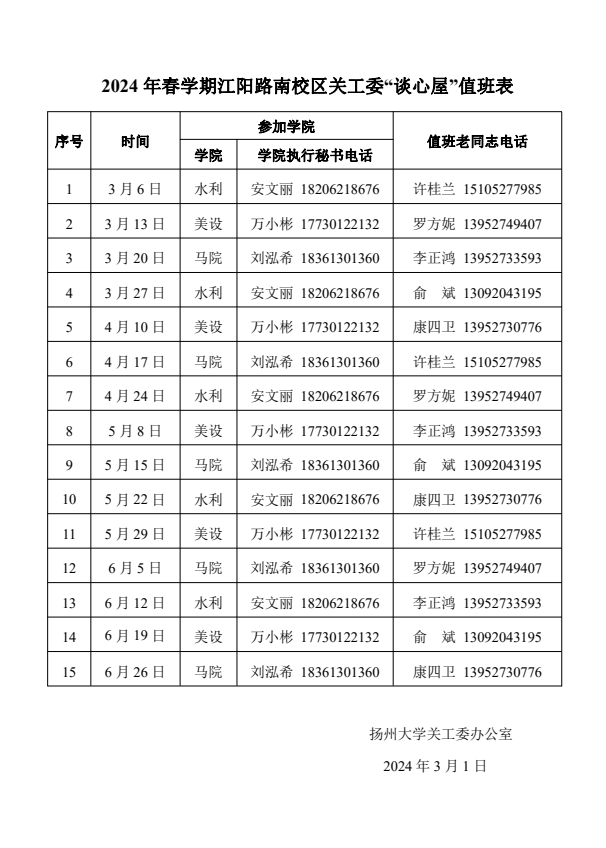 2024年春学期关工委“谈心屋”值班表