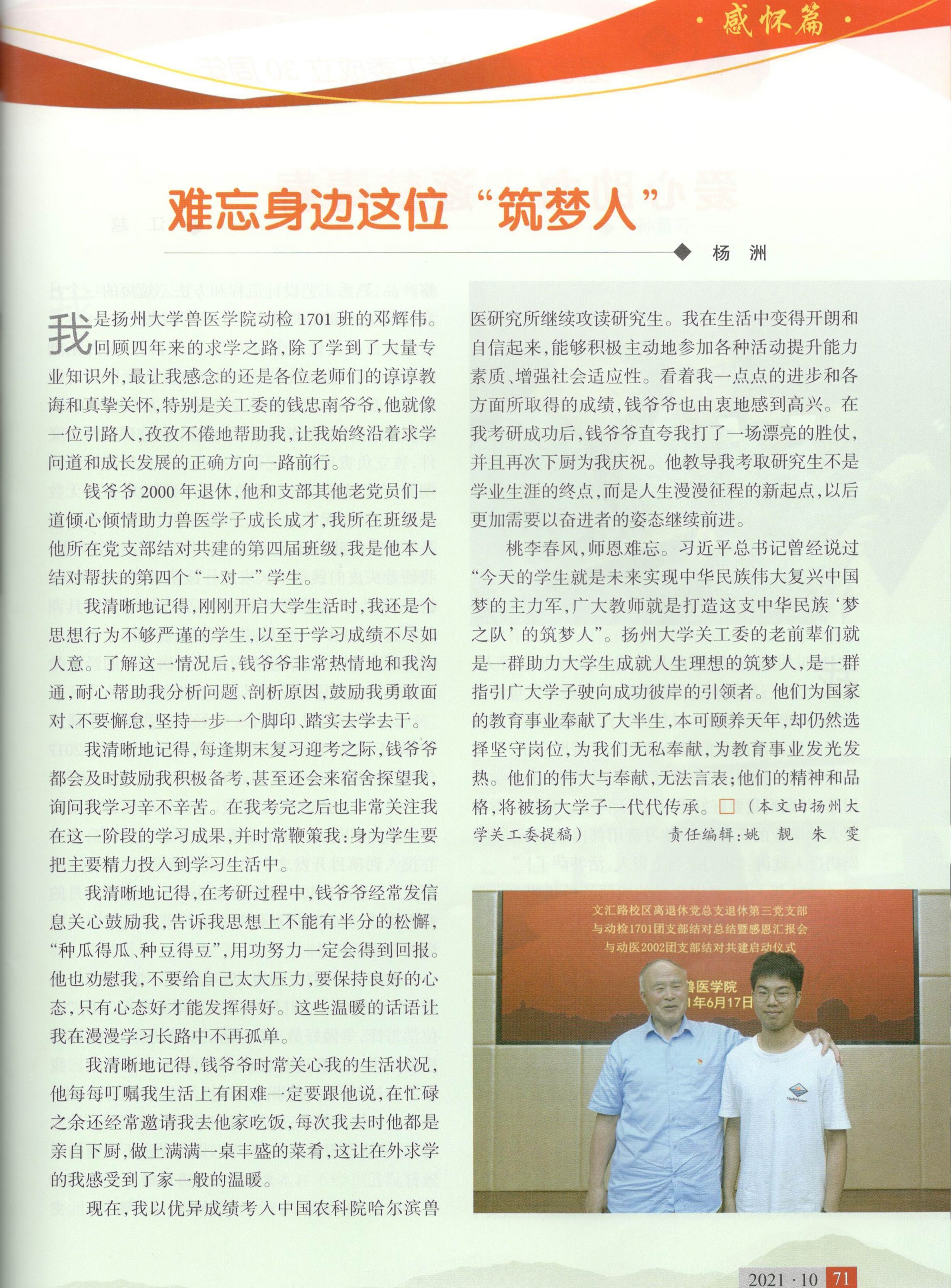 “厚德抱朴,弘道树人”,是扬州大学始终坚持的优良教风,也是扬大老师们立德树人、甘于奉献的生动写照。即将从扬大毕业、开启人生新征程的我,回顾四年来的求学之路,学到了大量专业知识,留下了许多人生美好回忆,而最让我感念的还是各位老师们的谆谆教诲和真挚关怀,特别是关工委退休老教师钱忠南爷爷,每当我遇到困难、感觉迷茫时,他就像一位引路人,孜孜不倦地帮助我,让我始终沿着求学问道和成长发展的正确航向一路前行。